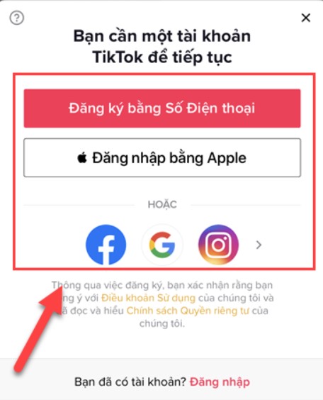Bước 2 : Đợi cho quá trình tải xuống và cài đặt ứng dụng hoàn tất => Mở ứng dụng Tik Tok và đăng ký tài khoản nếu bạn chưa có, thao tác đăng nhập: chọn mục Tôi ở góc phải dưới màn hình sau đó bạn chọn đăng nhập bằng một trong số những lựa chọn sau: số điện thoại, ID Apple, Facebook, Gmail, Instagram.