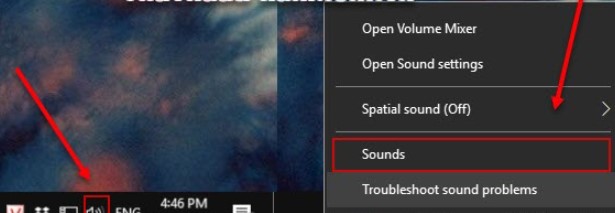 Bước 1: Đầu tiên các bạn tìm biểu tượng cái loa trên thanh công cụ (Taskbar) => click chuột phải vào biểu tượng cái Loa và chọn phần Sounds.