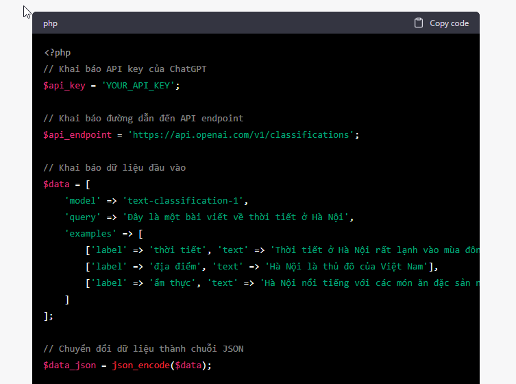 Trong ví dụ này, chúng ta khai báo API key của ChatGPT, đường dẫn đến API endpoint và dữ liệu đầu vào. Sau đó, chúng ta sử dụng hàm curl_init() để tạo một yêu cầu POST đến API endpoint, với dữ liệu đầu vào được chuyển đổi thành chuỗi JSON và header chứa API key. Cuối cùng, chúng ta kiểm tra kết quả trả về từ API và hiển thị chủ đề của văn bản