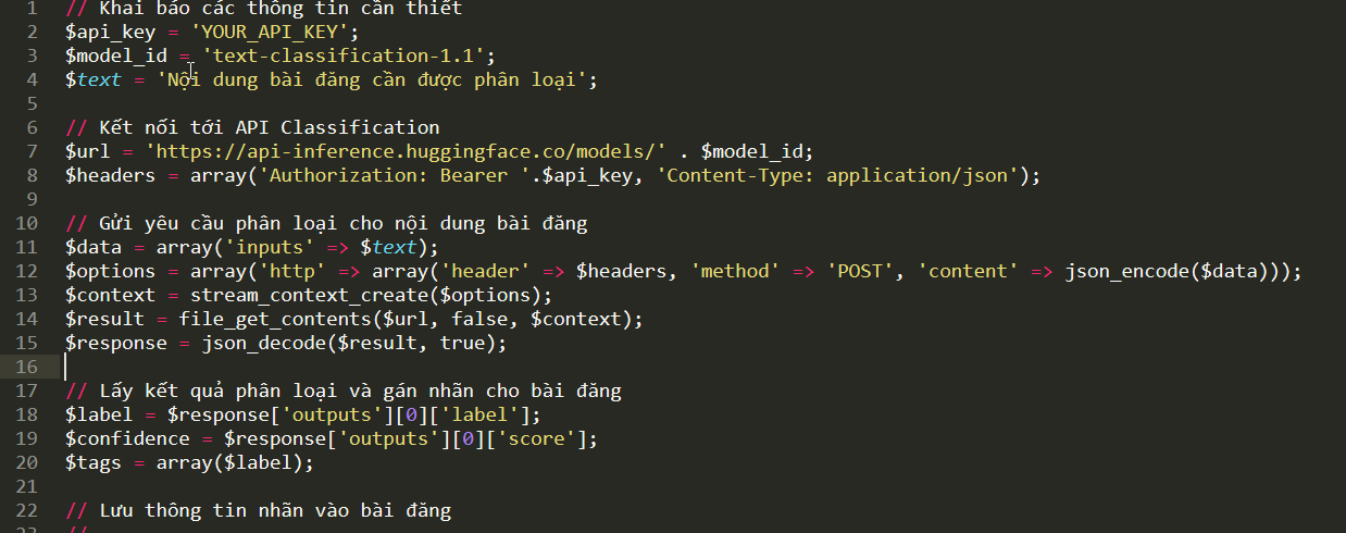 Tiếp theo, chúng ta sẽ viết mã PHP để kết nối tới API Classification và gửi yêu cầu phân loại cho các bài đăng trên blog.