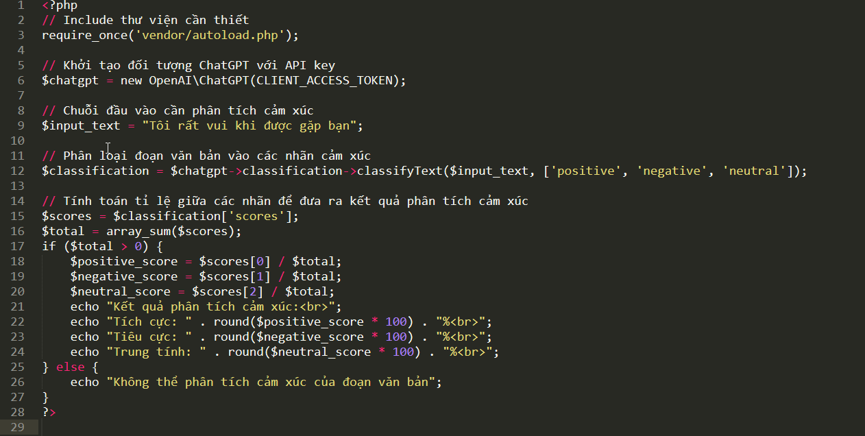 Dưới đây là ví dụ về cách sử dụng API Classification trong PHP để phân tích cảm xúc của người dùng từ dữ liệu đầu vào: