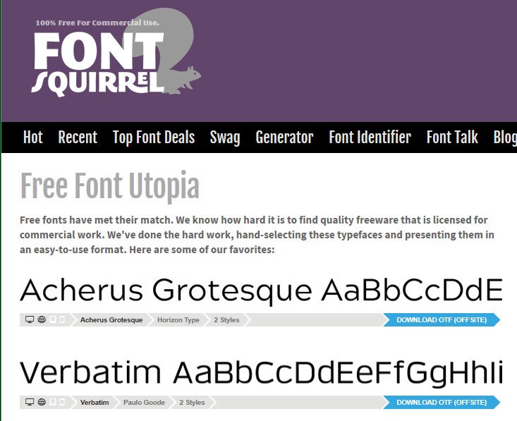 - Font Squirrel cung cấp hàng ngàn font chữ miễn phí với chất lượng cao và đa dạng về kiểu dáng, phong cách và thể loại. Bạn có thể tìm thấy các font chữ phù hợp với nhu cầu của mình dễ dàng trên trang web này.